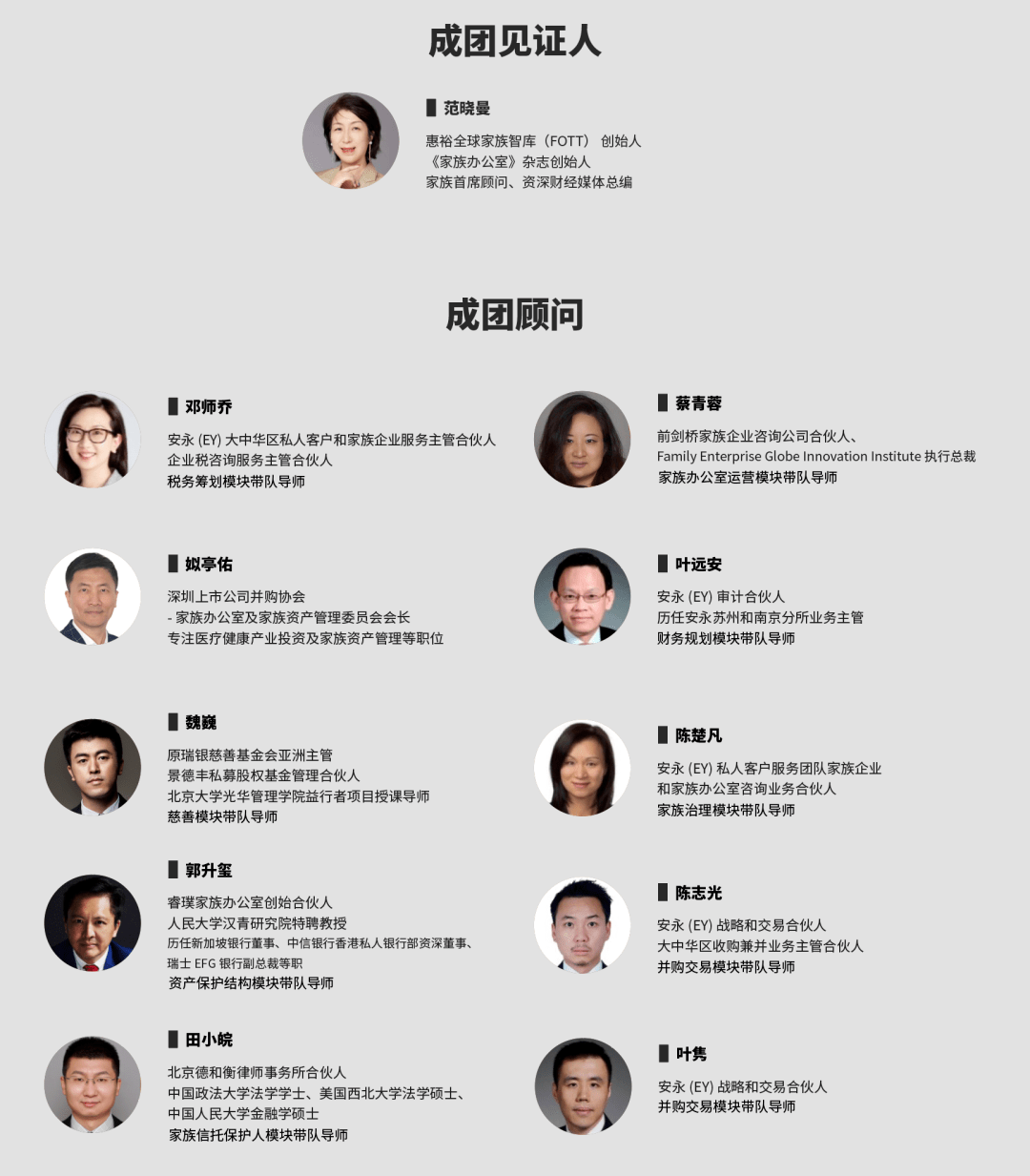 以宗族视角进行宗族财富的传承规划,包括财物维护、财物装备和股权类项目出资等内容。由终年宗族参谋、宗族传承顶层架构师、闻名PE/VC组织组成导师团,进行事例共享。
